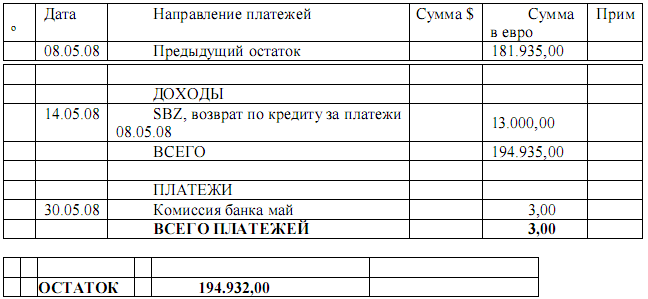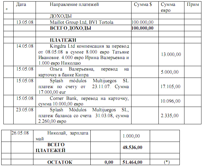 - “SBZ” получает 100.000$ “Maillot Group Ltd.”, BVI Tortola, 13/05/2008.