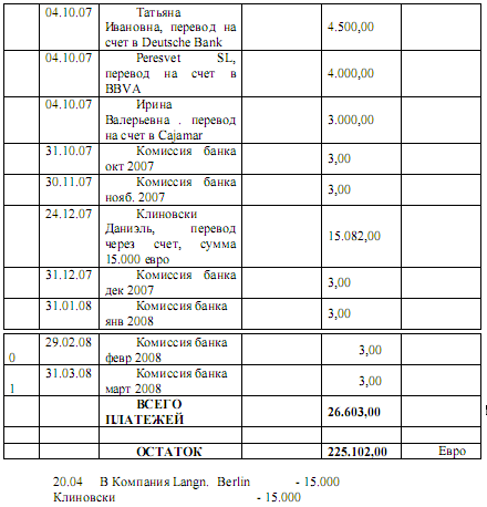 На счет 15 декабря 2006 года зачисляется срочный вклад от Татьяны Соловьевой, в Deutsche Bank в Барселоне, на сумму 1.899.950 евро