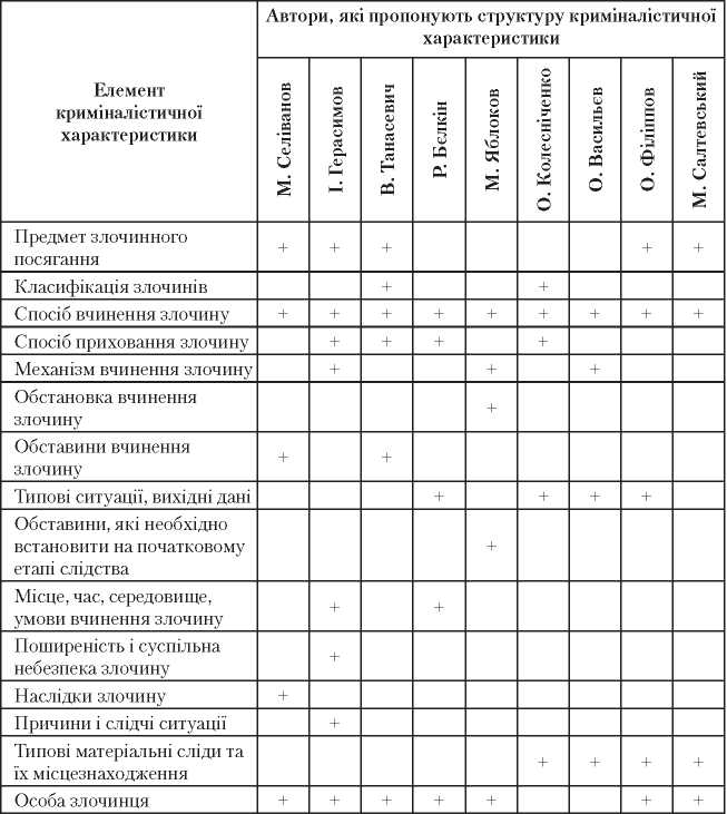Елементи криміналістичної характеристики — це ті ознаки, обставини, дані, які підлягають опису. Наведені визначення свідчать про відсутність єдиної думки в учених. Кожне визначення має різні елементи, причому кількість їх неоднакова. Для глибшого розуміння основних типових елементів криміналістичної характеристики злочинів доцільно ознайомитися з позиціями різних учених-криміналістів, які відображені в порівняльній таблиці (табл. 1).