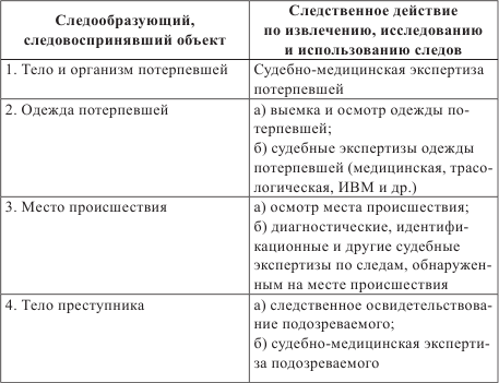 Эти типовые для изнасилования действия преступника неукоснительно должны привести к возникновению типовых следов на строго определенных объектах. Зная возможности следователя по работе с этими следами, следователь, как сказано выше, может составить в принципе исчерпывающую кассету следственных действий по извлечению, исследованию и использованию этих следов.