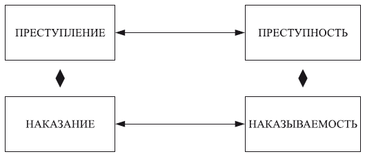 Заметим также, что в теории пенологии предложено различать понятия «наказание» и «наказываемость», под которой понимается «производное от преступности, относительно массовое, социальное, уголовно-правовое явление, складывающееся из совокупности наказаний, назначенных на определенной территории за определенный период времени»[511]. Профессором В. А. Никоновым предлагалась следующая схема системы взаимодействия таких элементов, как преступление, наказание, преступность и наказываемость[512].