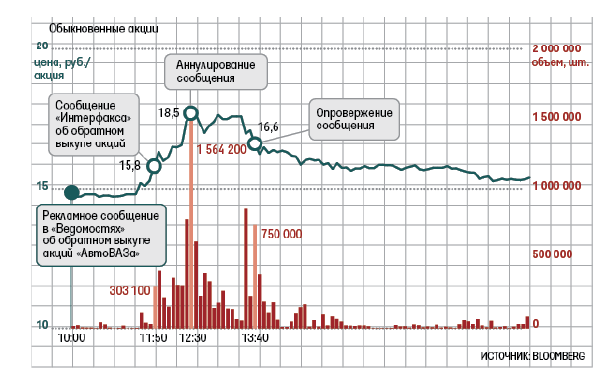 На практике выявить факт манипулирования рынком, а тем более доказать причастность к нему определенных лиц достаточно сложно. В России в последнее время было зафиксировано несколько случаев подобного поведения. Наиболее громким примером манипулирования рынком в случае положительных результатов проверки, осуществляемой ФСФР[1102], может стать ситуация, сложившаяся с акциями ОАО «АвтоВАЗ». По информации газеты «Ведомости» 20 декабря 2012 года в течение часа стоимость указанных акций выросла на 25 %, до 18,5 рублей за штуку. Привилегированные акции подорожали на 13 %. К полудню объем торгов бумагами «АвтоВАЗа» составил 180 млн рублей, притом что в среднем в декабре этот показатель колебался в диапазоне 2–5 млн рублей в день. Впрочем, затем началось падение. По итогам дня обыкновенные акции «АвтоВАЗа» выросли на 2,34 %, привилегированные – на 0,7 %, капитализация составила 30,9 млрд рублей. Объем торгов за день – 194,5 млн рублей. Рыночный ажиотаж был вызван ложными сообщениями о выкупе эмитентом собственных акций. Оно было опубликовано на правах рекламы 19 декабря в номере «Ведомостей». В сообщении со ссылкой на «АвтоВАЗ» говорилось, что с 19 декабря по 21 января проводится выкуп акций по 24,17 рублей за штуку. Кроме того, до конца 2012 года планируется завершить переговоры о выкупе долей «Ростехнологий» (28,89 %) и «Сбербанк CIB» (20,14 %), говорилось в публикации. Сообщения такого же содержания появились на лентах «Интерфакса» и на одном из сайтов РБК в 11:51 и 11:41 МСК соответственно. В 12:31 «Интерфакс» отозвал сообщение об оферте. А в 13:39 выпустил опровержение. С сайта РБК новость тоже была удалена. Официальный представитель эмитента заявил, что «АвтоВАЗ» никакого отношения к рекламе не имеет[1103].