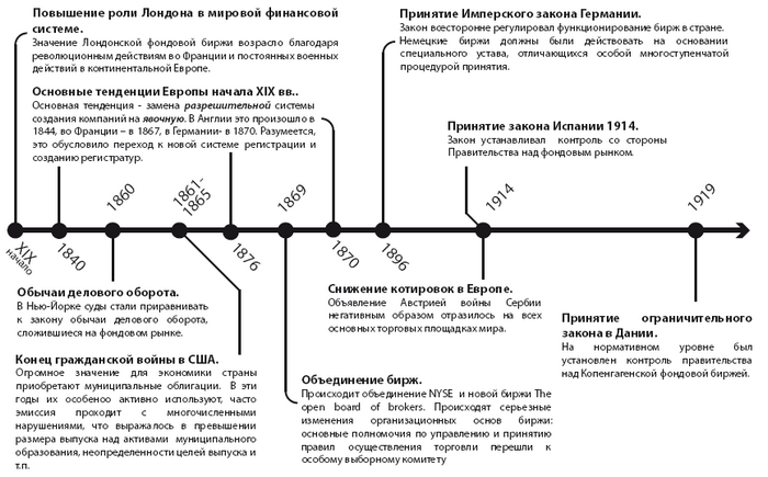 …до 1914 отношения между национальными правительствами и биржами преимущественно отсутствовали. Однако в конечном итоге ситуация изменилась коренным образом: правительства стали широко контролировать рынок ценных бумаг посредством фондовых бирж.