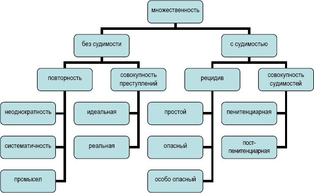 Соответственно институт множественности преступлений приобретает законченный вид как в плане необходимого отражения его субъективно-объективной сущности и содержания, так и классификации на видовом, подвидовом и подподвидовом уровнях. Именно данная структура должна быть отражена в уголовном законе, что, конечно же, потребует выделения множественности преступлений в качестве самостоятельного института уголовного права, на чем давно настаивала наука уголовного права. При этом очень важно отразить субъективные составляющие множественности преступлений (повторность и рецидив), что постоянно подвергается забвению и теорией уголовного права, и уголовным законом, но без чего множественность теряет всяческий смысл.