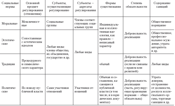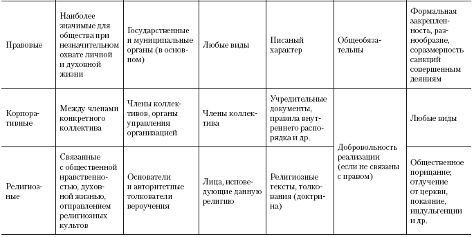 Все социальные нормы действуют взаимосвязано. Нередко одно и то же поведение признается нежелательным различными социальными регуляторами. Допустим, кража будет и плохим (мораль), и греховным (религия) и противоправным деянием. Следует отметить, что нормы права практически всегда соседствуют с иными социальными нормами. Например, на защите собственности стоят и право, и мораль, и религия, и корпоративные нормы. Взаимосвязь проявляется также и в том, что неправовые нормы могут получить правовое оформление. В качестве подтверждения можно привести установление административной ответственности за появление в общественных местах в состоянии опьянения, оскорбляющем общественную нравственность (нарушение норм морали) или закрепление трудовым законодательством религиозных праздников (Рождество Христово). Социальные нормы отличаются друг от друга по следующим основаниям (табл.)[11]: