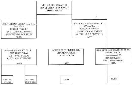В 1999 году, супруги Кузьмины были владельцами 100 акций на предъявителя панамской “Banff Investment S.A.” В 2002 году, были владельцами 10 акций на предъявителя панамской Kost de Inversiones S.L. Как уже было сказано ранее, передали адвокатской конторе “Estudio Juridico de Fortuny y Asociados” сертификат на 100 акций на предъявителя для хранения в сейфе в ее офисе, и конверт, в котором хранились 10 акций на предъявителя другой компании. Подтверждающие документы:
