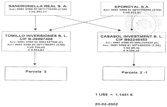 - Sandronella Real S.A. передает свои акции, указанные в описательной части договора (3.005 акций компании CASASOL INVESTMENT S.L.), коммерческому предприятию EPOROYAL S.A., которая приобретает их за 3.005€.