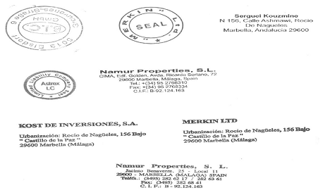 Наконец, в доме Олены Бойко, был найден лист бумаги, с пробами печатей, среди которых присутствуют печати таких компаний, как Merkin LTD, Kost de Inversiones S.L., Namur Properties S.L., B.I.C. GMBH, и ASTREX LC.
