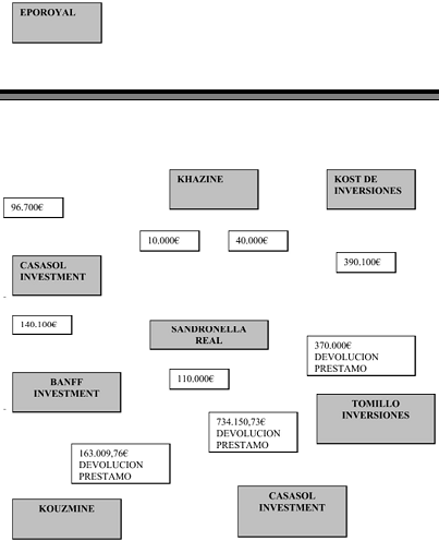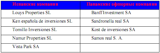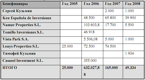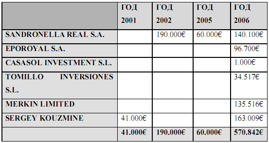 S ANDRONELLA REAL S.A. которую используют для оплаты задолженности перед Леонидом Хазиным. Хазин работает на корпоративную сеть Сергея Кузьмина, но в глаза бросается тот факт, что оплата его услуг в 2002 году на сумму 40.000 евро, поступила со счета одной из панамских компаний, а не со счетов испанских компаний, которые изначально были клиентами Хазина