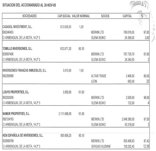 Согласно официальному документу от 11/02/2002, Сергей Кузьмин, представляющий компанию “Inversiones Finanzas Inmuebles SL” (управляющей, в свою очередь, “Tomillo Inversiones SL”) предоставляет генеральную доверенность в пользу Франсиско Оканья Пальма (Р1401Д0К6 стр. 332 и сл.)