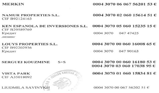 По зарегистрированному месту жительства Олены Бойко был найден контракт предоставления услуг и комиссии от 11/02/2002, между “Inversiones Finanzas Inmuebles SL”, в лице Франсиско Оканья Пальма, и “Namur Properties SL”, в лице Сергея Кузьмина (Р1001Д0К03015 стр. 194). Позднее, 27/07/2003 он был назначен уполномоченным лицом “Namur Properties SL”[22]