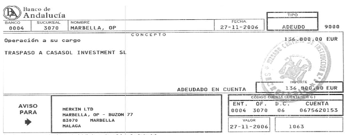 Кроме того “Vista Park S. A” оплачивает со счетов в Banco de Andalucia (№ 0004 3070 01 0601583481) расходы на поставку дизельного топлива, электричество, телефон, по крайней мере, в 2006 и 2007 годах.