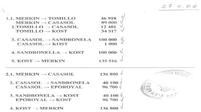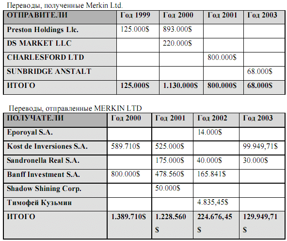 Кроме того, подтверждаются многочисленные и частые движения денежных средств, которые имеют разных плательщика / получателя этой компании или Наталью Маркулову и “Kost de Inversiones SA” или “Merkin Ltd” в период между 2004 и 2008 гг.