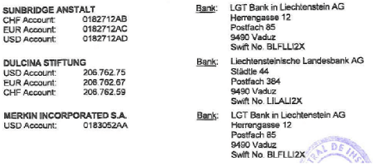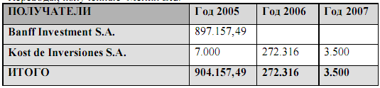 В 2000 году получены переводы в иностранной валюте (доллары США) из Швейцарии в размере 608.470 евро, с назначением платежа "Инвестиции по акциям, не допущенным к торгам" и из Панамы, в той же валюте и с тем же назначением в сумме 35. 092, 85 евро.