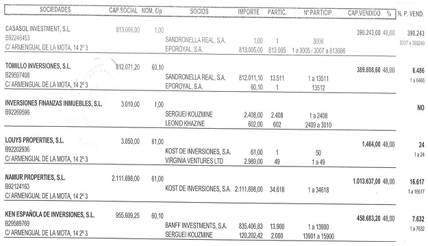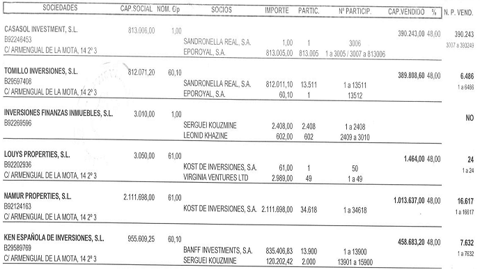Акции “Inversiones Finanzas Inmuebles S. L.” принадлежат Сергею Кузьмину (2.048) и Леониду Хазину (602).