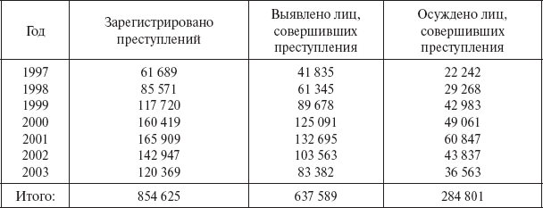 Таким образом, за семь лет (1997–2003 гг.) по статьям главы 22 УК РФ было зарегистрировано 854 625 преступлений, выявлено 637 589 человек, их совершивших, из которых 284 801 человек был осужден. Цифры достаточно внушительные, однако обращает на себя внимание факт, что только 44,6 % из числа выявленных, согласно статистике МВД, лиц, совершивших преступления, были осуждены. Больше половины уголовных дел, возбужденных в отношении конкретных лиц, было прекращено за недоказанностью и иным, реабилитирующим и нереабилитирующим основаниям.