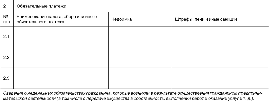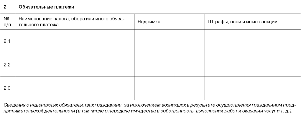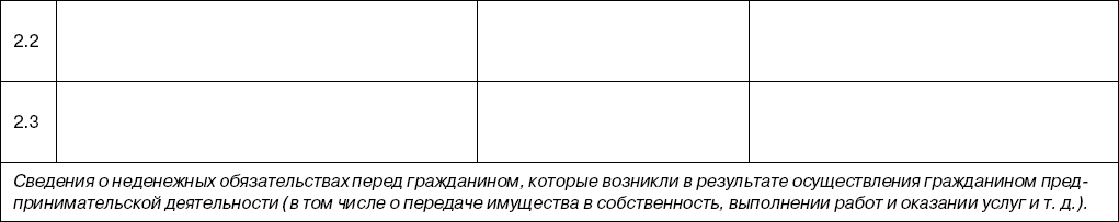 35 Указывается размер просроченной задолженности по сумме основного обязательства (с процентами) по состоянию на дату составления списка кредиторов и должников гражданина (за исключением неустойки (штрафа, пени), процентов за просрочку платежа, убытков в виде упущенной выгоды и иных финансовых санкций, начисленных на сумму основного обязательства). Для обязательств, выраженных в иностранной валюте, сумма указывается в рублях по курсу Банка России на дату составления списка кредиторов и должников гражданина.