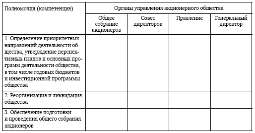 Поставить отметку на пересечении колонок «Полномочия (компетенция)» и «Органы управления акционерного общества», если считаете, что данный вопрос относится к компетенции соответствующего органа».
