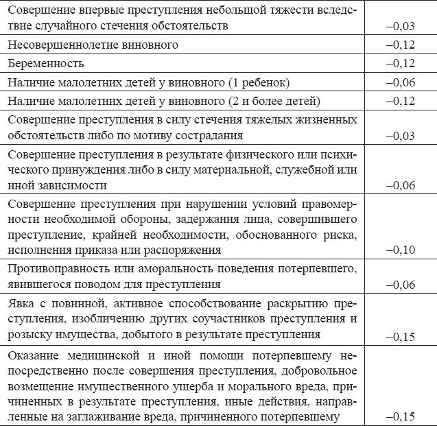 Коэффициенты влияния на наказание смягчающих обстоятельств