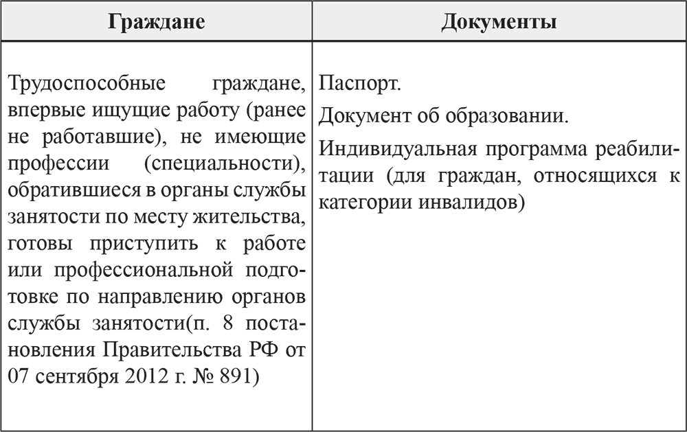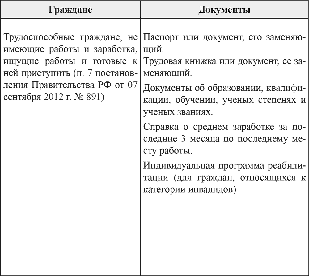 Таблица 7.1. Документы, необходимые для регистрации гражданина в целях поиска подходящей работы