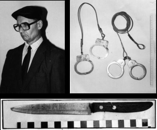 Чикатило в своей рабочей одежде. Справа: его «именные» наручники, имеющие большую степень свободы для проведения многочасовых следственных действий. Внизу: нож, которым маньяк совершил несколько убийств