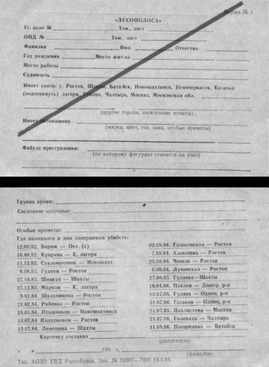 …В уголовном розыске Ростовского ГУВД в те годы я своими глазами видел несколько шкафов, где стояли ящики с карточками литерного дела «Лесополоса» – ни много ни мало двадцать пять тысяч карточек, куда заносились сведения о попавших в поле зрения милиции. В картотеку автоматически попадали лица, задержанные в лесополосе, имеющие сексуальные отклонения; туда же заносились данные о водителях автотранспорта, оказавшихся в районе преступления. Особенно тщательно отрабатывались подозреваемые, имеющие четвертую группу крови, независимо от алиби или места их работы.