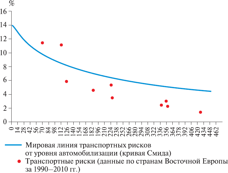 Учитывая все сказанные выше, национальные данные стран – «новичков автомобильного мира», включая Россию, должны, казалось бы, располагаться во всяком случае ниже «мировой линии», определенной кривой Смида, и превосходить тем самым показатели транспортных рисков, характерных для развитых стран в эпоху пионерной автомобилизации.