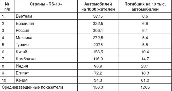 В табл. 12 и 13 представлены данные по уровням автомобилизации и транспортных рисков соответственно в развитых странах «пионерной» автомобилизации за 1938 г. и странах «догоняющей» автомобилизации из списка «RS-10» за 2010 г.