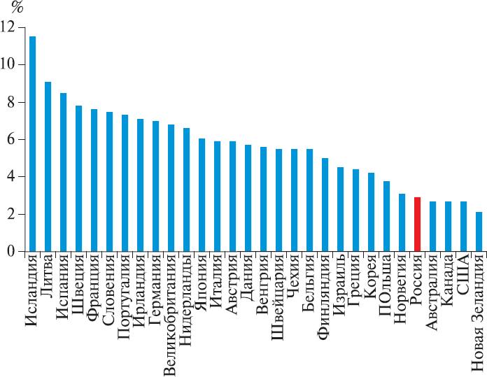 Рис. 22. Среднегодовые темпы снижения смертности в ДТП по зарубежным странам за 2001–2010 гг., по РФ за 2006–2011 гг.