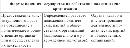 Конституции XIX в. даже не упоминали о политических партиях, хотя партии уже тогда занимали видное положение в государственнo-политической жизни, а сейчас регулирование их деятельности – самостоятельный правой институт. Обычно в законодательстве современных государств отражаются следующие моменты: понятие политической партии; определение места и роли в политической системе общества; условия и порядок создания и прекращения деятельности политических партий; требования к идеологии и программной позиции партии; требования к организационному строению и порядку деятельности партий; финансово-экономическая база партии; взаимоотношения с публичной властью, прежде всего участие в выборах и в деятельности представительных органов государства и местного самоуправления, и т. д.
