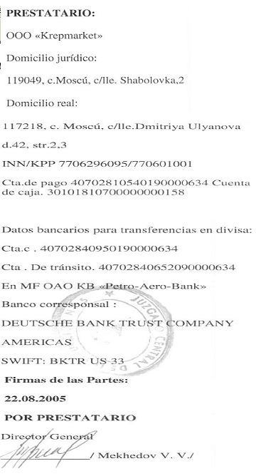Среди изъятых документов значится кредитное соглашение, совершенное в г. Москве между компанией “Peresvet S.L”, как кредитора, и компанией “Krepmarket”, как заемщика, на сумму 700.000 евро, от 22 августа 2005г.