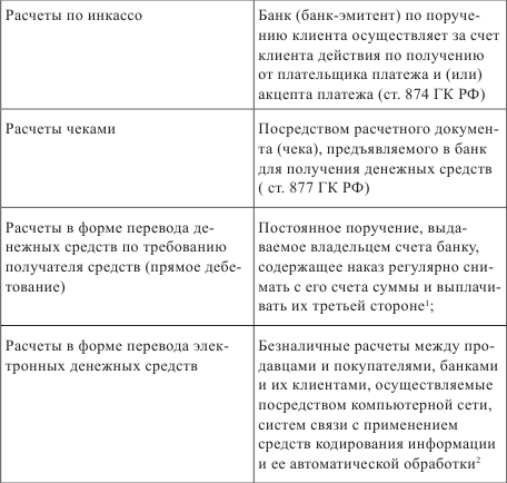 Формы безналичных расчетов. Гражданское законодательство (ст. 862 ГК РФ) допускает при осуществлении безналичных расчетов использование следующих форм расчетов: расчеты платежными поручениями, по аккредитиву, чеками, расчеты по инкассо, а также расчеты в иных формах, предусмотренных законом, установленными в соответствии с ним банковскими правилами и применяемыми в банковской практике обычаями делового оборота[364].
