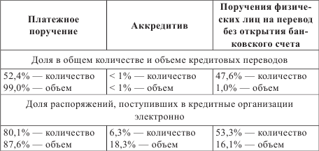 В России кредитовые переводы являются одним из основных платежных инструментов для совершения безналичных операций. Их доля в общем количестве поступивших в кредитные организации платежных распоряжений составляла 21,2 %, а в общем объеме достигала 96,2 %.