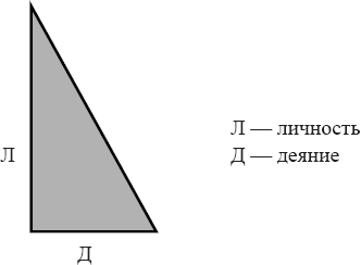 Для вычисления суммарной общественной опасности на основании построенной шкалы оценки обстоятельств, характеризующих общественную опасность деяния и личности виновного, В. Л. Чубарев использует в качестве модели общественной опасности прямоугольный треугольник (рис. 5), «катеты которого будут символизировать направленность и величину общественной опасности личности и ее деяния, а гипотенуза ограничит объем общественной опасности преступления как площадь, замкнутую между найденными значениями общественной опасности личности и деяния».[1351] При этом общественная опасность вычисляется автором как площадь данного треугольника.[1352]