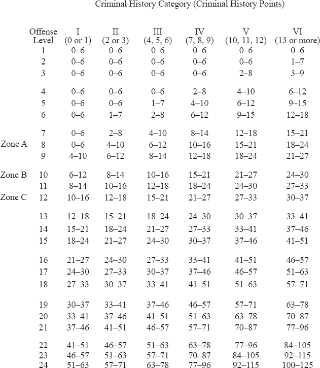 Таблица наказаний из Федеральных руководств по назначению наказаний США