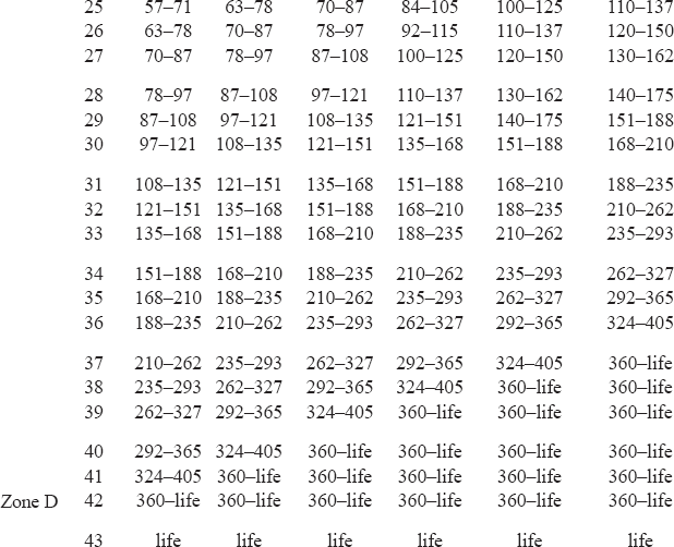 Основой Руководств является приведенная ниже таблица по назначению наказаний (табл. 6). Таблица построена по двум параметрам. Вертикальная ось отражает 43 уровня преступлений. Горизонтальная делит таблицу на 6 столбцов и классифицирует криминальное прошлое осужденного. В графах таблицы указаны соответствующие уровню преступления и криминальному прошлому осужденного минимальные и максимальные размеры наказаний в месяцах. Как видно из таблицы, расстояние между минимальными и максимальными пределами наказаний достаточно незначительно. Но по мере увеличения тяжести наказания оно увеличивается. Если при наказаниях до двух лет девяти месяцев лишения свободы разрыв между минимумом и максимумом не превышает шести месяцев, то далее он становится равным уже семи месяцам лишения свободы и достигает своего максимума в 81 месяц (6 лет 9 месяцев) лишения свободы при назначении наказаний, максимальный предел которых равен 33 годам 9 месяцам лишения свободы. Таким образом, можно отметить, что свобода судейского усмотрения, предоставленная при назначении наказания судье в США, существенно меньше свободы, предоставленной в этом вопросе его российскому коллеге.