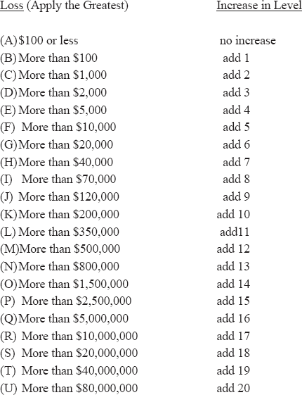 Таблица увеличения базового уровня кражи в зависимости от стоимости похищенного из Федеральных руководств по назначению наказаний США