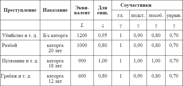 Несомненным достоинством системы измерения общественной опасности, предложенной Н. Д. Оранжиреевым, является то, что она может быть использована на практике для назначения наказания и предназначена в первую очередь именно для этого. Сопоставление преступления и наказания становится возможным благодаря тому, что автор делит наказание по видам и срокам и так же, как и преступлениям, присваивает им математические эквиваленты: более высокий – более тяжкому наказанию, и наоборот. Кроме того, наказание должно понизиться на величину смягчающих обстоятельств F (F = A ? B ? C ? D).[1326]