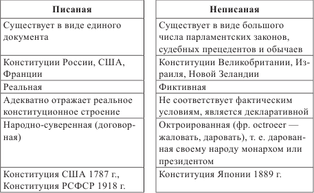 С точки зрения формы, принято делить конституции на писаные и неписаные. Под писаной конституцией понимается единый нормативно-правовой акт, обладающий высшей юридической силой, принимаемый и изменяемый в особом порядке, кодифицирующий правовые нормы, регулирующие важнейшие общественные отношения. Неписаная конституция представляет собой совокупность нескольких законов, закрепляющих организацию верховной государственной власти, права и свободы граждан. Классический пример – английская конституция, состоящая из множества правовых актов – от Великой хартии вольностей 1215 года до Закона о министрах Короны 1937 года.