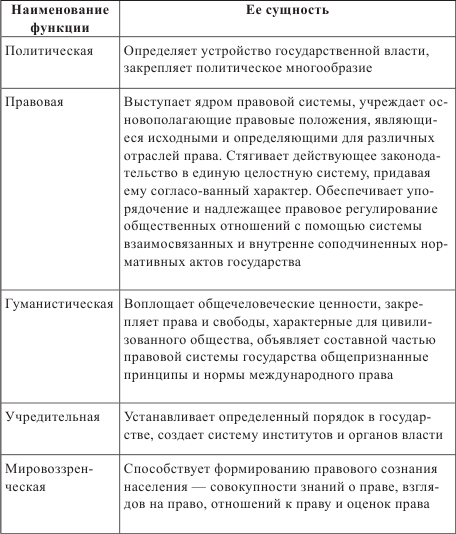 В современном правоведении под конституцией понимается основной закон (или система законов) государства, обладающий высшей юридической силой, принимаемый и изменяемый в особом порядке, закрепляющий основы общественного строя, правовой статус человека и гражданина, а также форму конкретного государства.