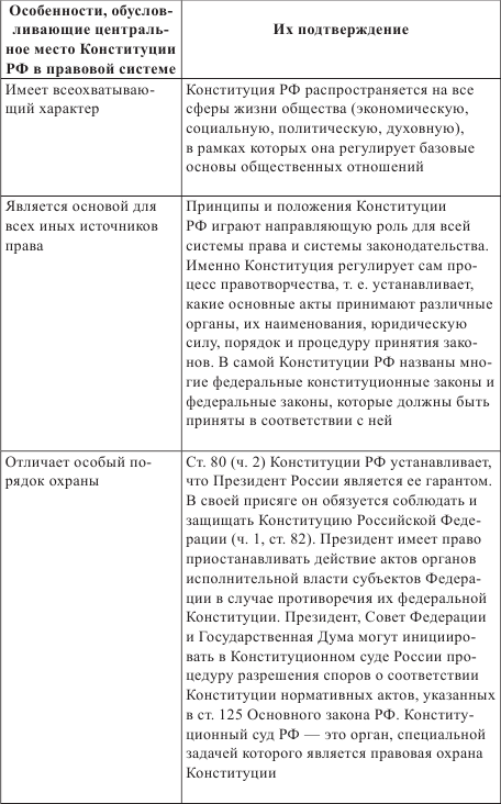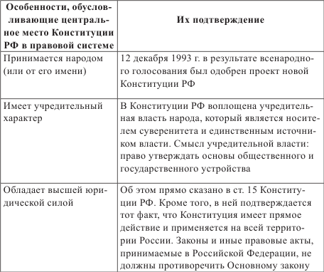 Конституция РФ является Основным законом Российской Федерации, ядром ее правовой системы. Конституция Российской Федерации имеет высшую юридическую силу, прямое действие и применяется на всей территории Российской Федерации. Верховенство Конституции означает, что она возглавляет всю систему нормативно-правовых актов (и всех источников права вообще). Высшая юридическая сила Конституции проявляется в том, что все законы и иные правовые акты не должны ей противоречить. Конституция РФ имеет прямое действие, т. е. ее нормы непосредственно регулируют важнейшие общественные отношения без какого-либо дополнительного, передаточного механизма. Хотя существование последнего вовсе не отрицается – конституционные нормы могут быть детализированы текущими актами, но при отсутствии таковых нормы они действуют непосредственно.