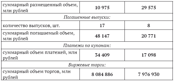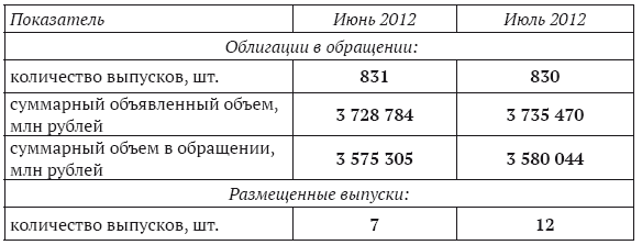 Состояние рынка биржевых облигаций (2011 год)[423]. На долю развивающегося института биржевых облигаций пришлась одна треть совокупного объема выпусков, размещенных на фондовой бирже ММВБ. За 2011 год к выпуску биржевых облигаций прибегло 54 заемщика, разместившие 83 выпуска суммарным объемом по номиналу 307,6 млрд рублей.