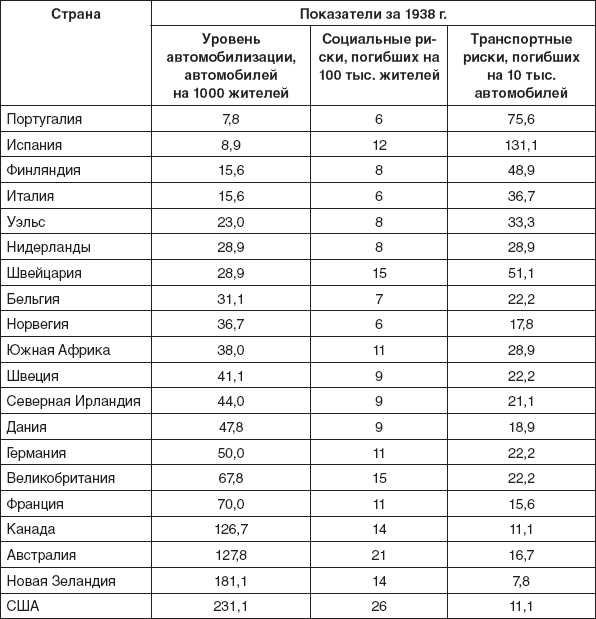 Одновременно общественность этих стран стала осознавать оборотную сторону обретенной транспортной свободы и удовольствия вождения: смертность в ДТП впервые стала значимой компонентой убыли населения. Уровень социальных рисков составил в разных странах от 10 до 26 погибших в расчете на 100 тыс. жителей. Наихудший показатель был зафиксирован в самой автомобилизированной стране – США. В рамках представлений того времени это было вполне естественно: практически повсеместно наблюдалась жесткая корреляция роста социальных рисков с темпами развития автомобилизации.