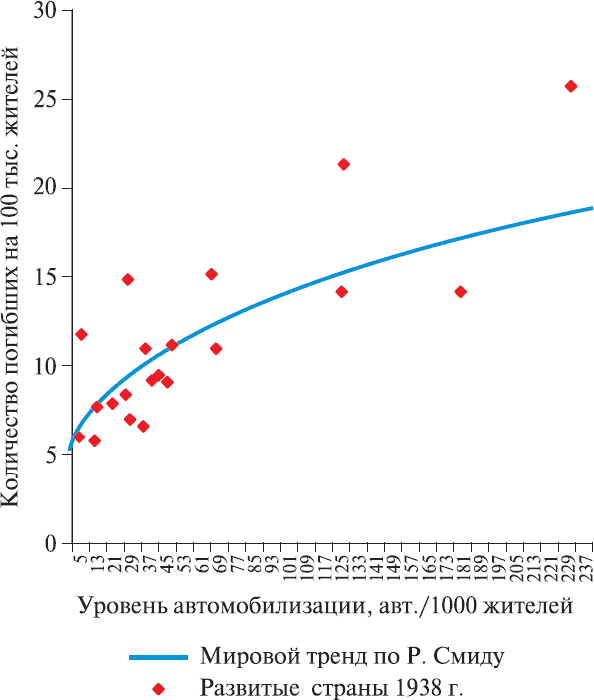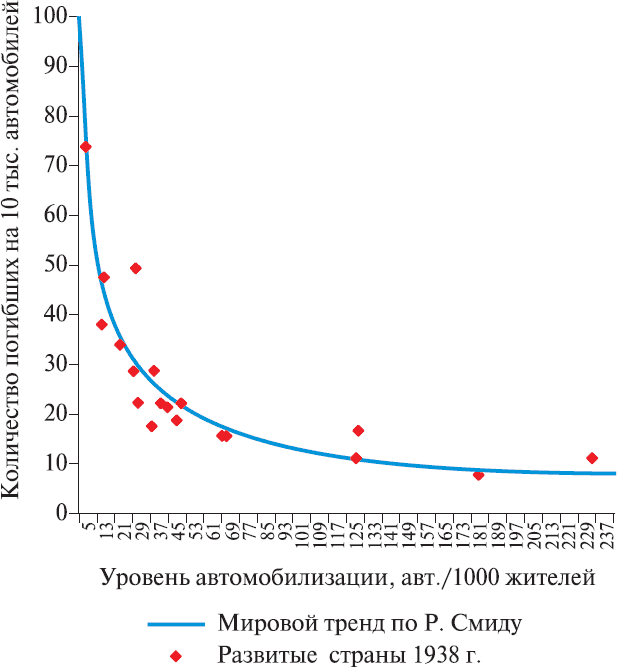 Профессор Лондонского университетского колледжа Р. Смид в статье, опубликованной в «Journal of Royal Statistics» – ведущем мировом журнале по математической статистике, предложил простую, но как показал дальнейший опыт, чрезвычайно удачную модель, связывающую транспортные и социальные риски с уровнем автомобилизации в стране [Smeed, 1949]. Он проанализировал статистику смертности в ДТП по 20 странам мира, располагавших к середине 1930-х годов значительным автомобильным парком, и пришел к выводу, что смертность в ДТП в расчете на единицу парка автомобилей убывает по мере роста автомобилизации населения гиперболически: А–2/3, где A – количество автомобилей на 1000 жителей.