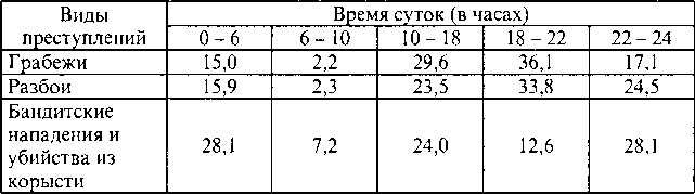 Большинство нападений совершается в темное время суток (от 70 до 80 %). Темное время суток имеет различную протяженность в течение года. Так, зимой оно достигает 16 часов, а в летнее время сокращается до семи с половиной часов. И все же представляет интерес рассмотрение количества корыстно-насильственных преступлений, совершаемых в форме нападений, по времени суток независимо от времени года.