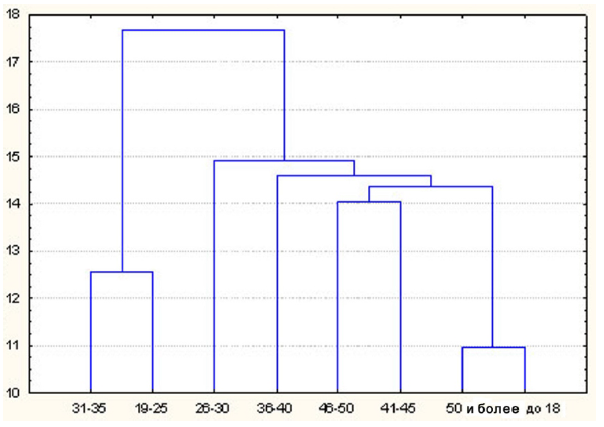 Кластерный анализ (см. рис. 32) выявил две группы распределения по возрастному фактору в зависимости от влияния особенностей психотравмы: 1) 31–35 и 19–25 лет; 2) до 18 и более 50 лет.