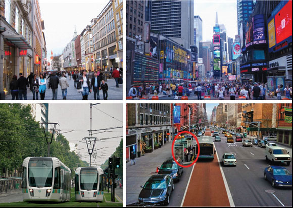 Воплощением этой идеи в жизнь стали активные преобразования городских центров по обе стороны Атлантики, включая демонтаж эстакадных элементов улично-дорожной сети (рис. 19), устройство комфортной среды под лозунгом «улица для пешеходов» (рис. 20), а также во многих случаях сооружение рельсовых систем общественного транспорта.
