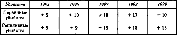 Темпы роста первичных и рецидивных убийств находятся примерно в одном «режиме». Однако, в 1997—1998 гг. рецидивные убийства опережают движение первичных убийств, не говоря еще о том, что они увеличились и численно на 65% (относительно 1994 г.), а первичные на 62%. Эти тенденции пока сохраняются и в 1999 г. Вообще говоря, определенное соотношение первичных и рецидивных убийств явление весьма сложное. Это соотношение изменяется очень медленно.