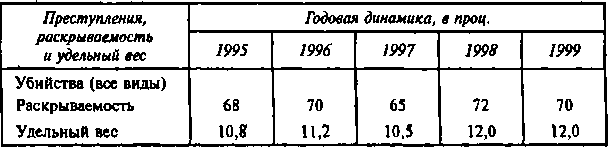 Интенсивность убийств связана с многими факторами. Например, из числа лиц в возрасте 30—40 лет, осужденных за убийство, а до этого судимых по два-три и более раза, 40% начали свою карьеру в несовершеннолетнем возрасте. Среди несовершеннолетних, впервые судимых за убийство, 50% были вовлечены в эти преступления взрослыми, судимыми по два-три и более раза. Преступность имеет высокие коэффициенты именно в тех регионах, где высоки коэффициенты убийств, как и других насильственных преступлений против личности. Все взаимосвязано. Насильственные преступления причинно связаны с убийствами, а убийства служат своеобразной реакцией на насильственные преступления. Особенно это касается связи насильственных преступлений против личности с убийствами. Многое зависит еще и от того, раскрыто или не раскрыто убийство, насколько активно выявляются лица, скрывающиеся от наказания. По нашим расчетным данным зависимость между раскрываемостью этих деяний и их удельным весом проявляется вполне очевидно.