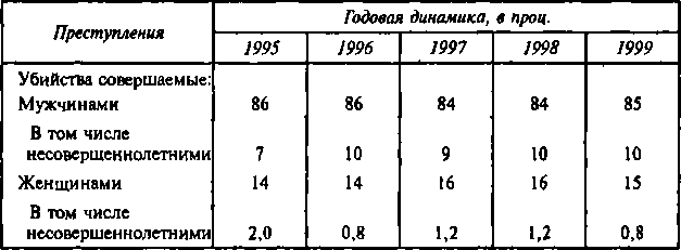 Как видно, положение дел достаточно стабильное. В течение 5 лет мужчины и женщины, несовершеннолетние обоих полов занимают почти неизменные положения в «системе» совершаемых ими убийств. Лица, совершающие рассматриваемые убийства, как правило, не работают и не учатся или работают эпизодически. Для них в целом характерно бесцельное времяпрепровождение. Их эпизодическая работа — это в основном неквалифицированный труд. Что касается учебы несовершеннолетних, то для подавляющего их числа школа — это учреждение принуждения. Несмотря на то, что среди убийц главным образом лица в возрасте до 35—40 лет, ими никак не решается семейная проблема. Как правило, у них нет постоянного места жительства. Нормальные человеческие отношения разрушены. Они общаются в основном только с себе подобными, да и здесь межличностные отношения искажены, уродливы. Изуродованы социальные связи, а направленность поведения — преступная, связанная с удовлетворением низменных потребностей. Все проблемы решаются путем насилия.